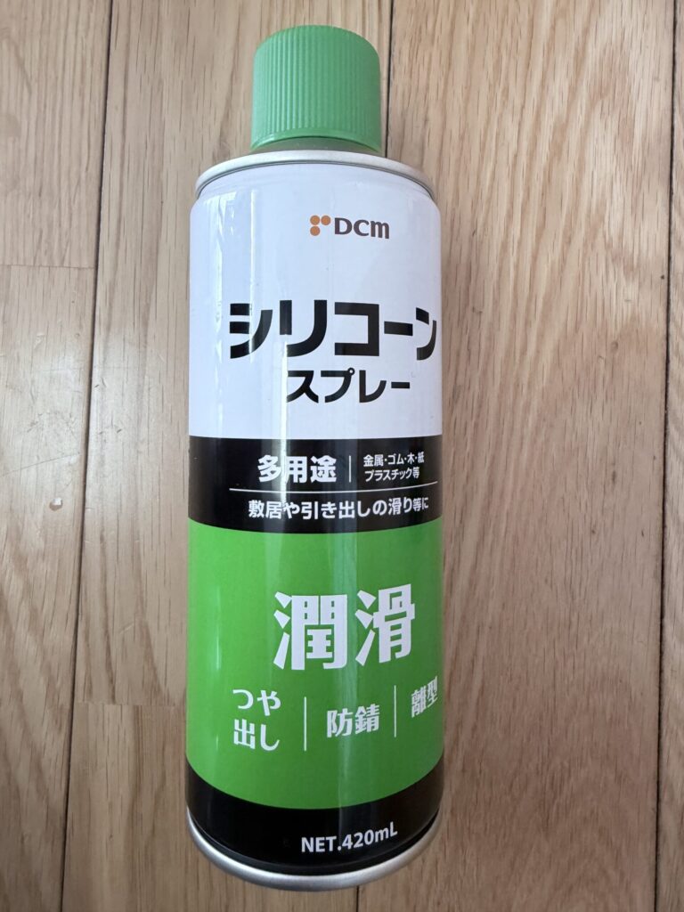 そこで便利なのが、シリコンスプレー。我が家では、ホームセンターで購入したシリコンスプレーを使っています。